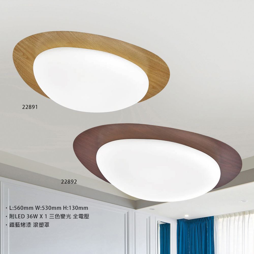 22891 ・L:560mm W:530mm H:130mm ・附LED 36W X 1 三色變光 全電壓 ・鐵藝烤漆 滾塑罩