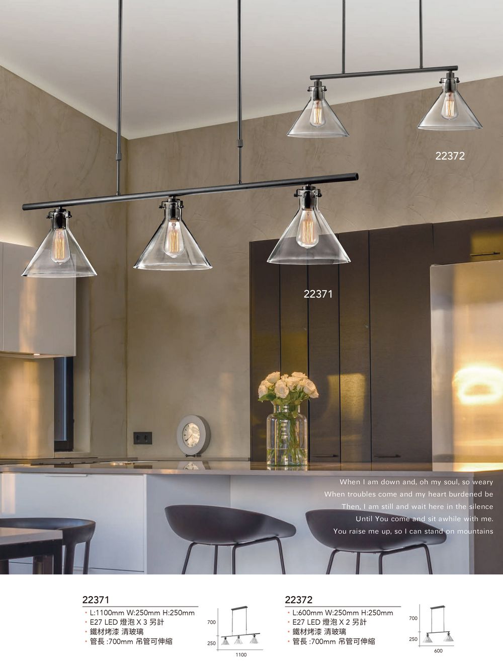 ・L:1100mm W:250mm H:250mm ・E27 LED 燈泡X 3 另計 ・鐵材烤漆 清玻璃 ・管長:700mm 吊管可伸縮
