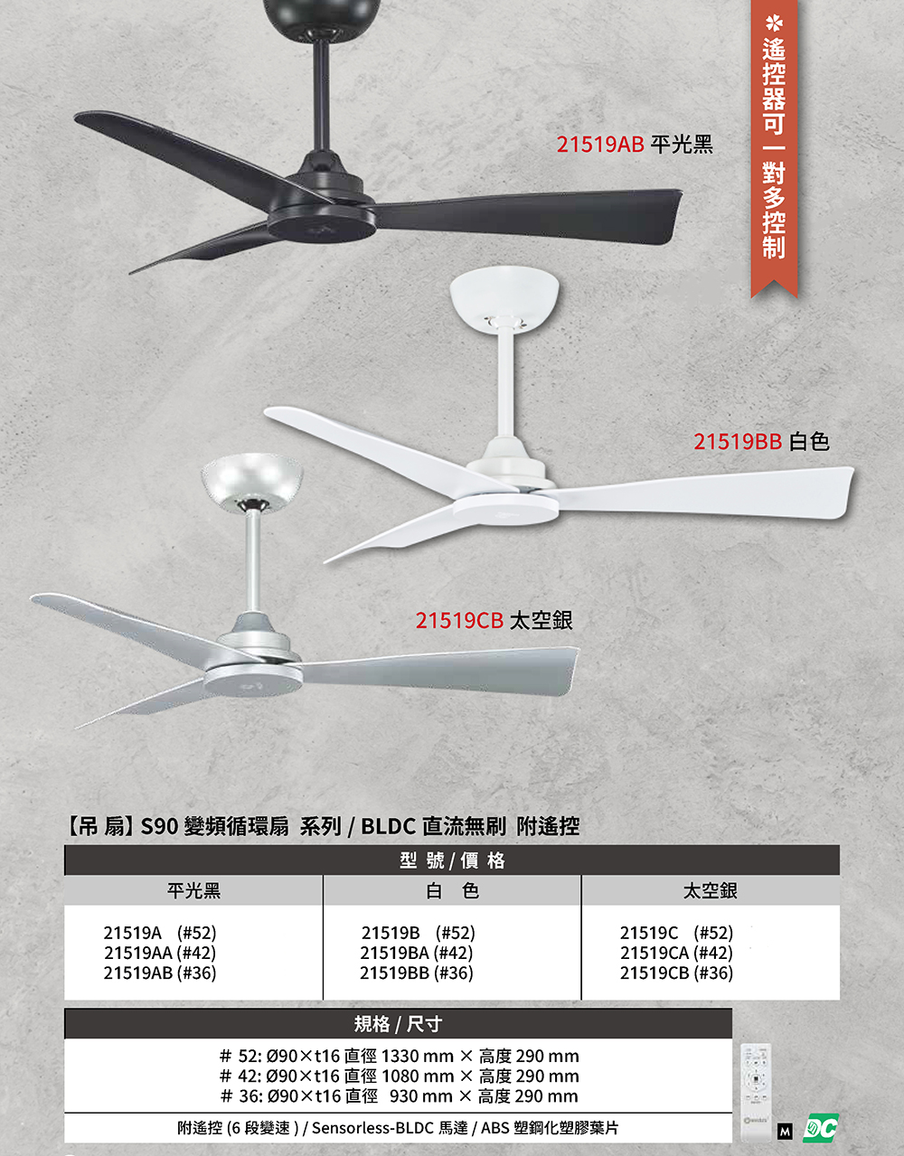 S90 變頻循環扇 系列/ BLDC 直流無刷 附遙控 附遙控(6 段變速) / Sensorless-BLDC 馬達 / ABS 塑鋼化塑膠葉片