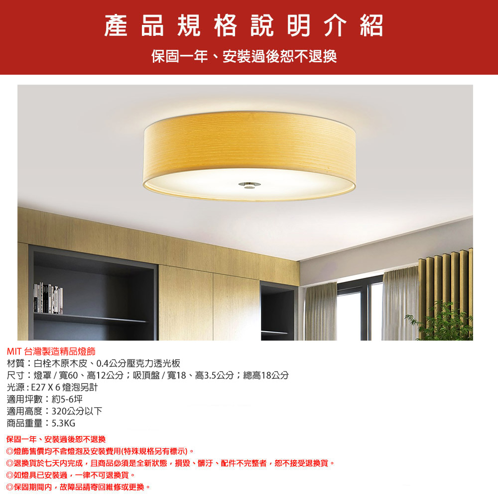 尺寸:燈罩 / 寬60、高12公分;吸頂盤 / 寬18、高3.5公分;總高18公分
