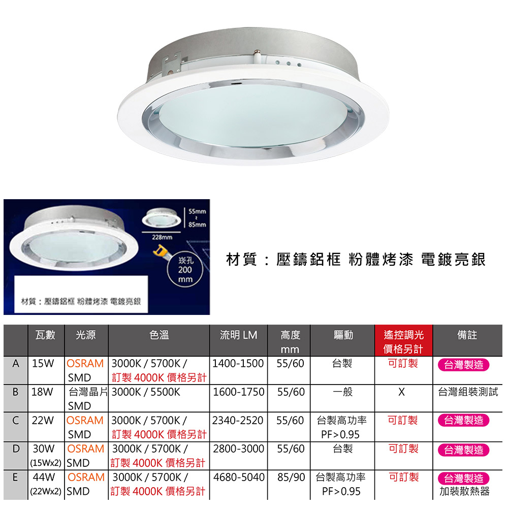 瓦數色溫 | 15W.3000K, 15W.5700K, 15W.4000K, 18W.3000K, 18W.5500K, 22W.3000K, 22W.5700K, 22W.4000K, 30W.3000K, 30W.5700K, 30W.4000K, 44W.3000K, 44W.5700K, 44W.4000K |
