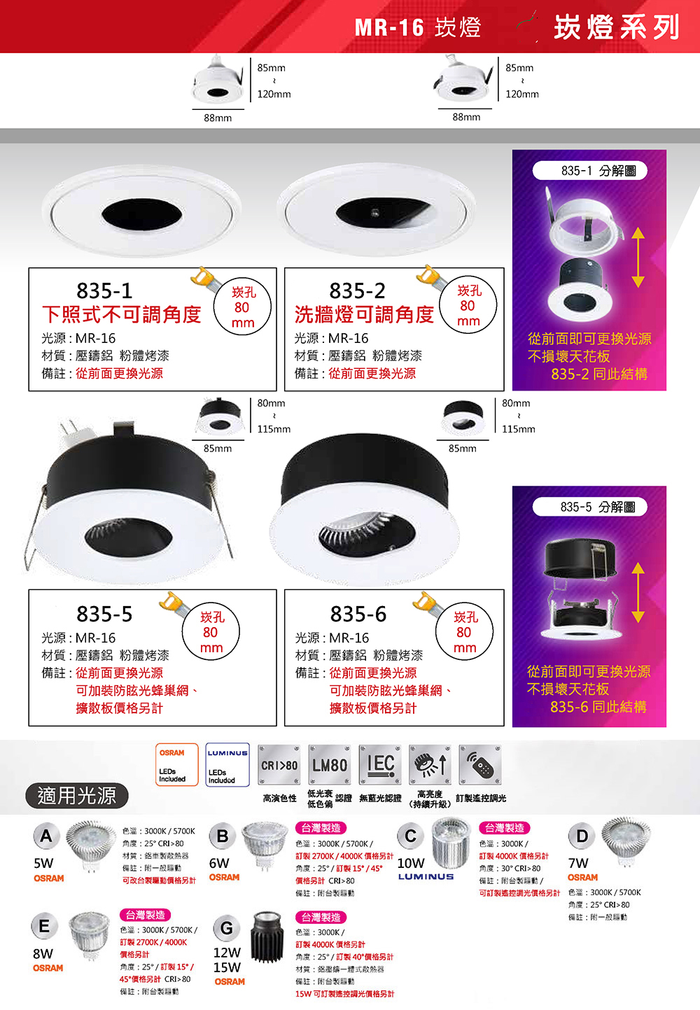 | 光源 | 空燈具不含光源, 5W.3000K, 5W.5700K, 6W.3000K, 6W.5700K, 6W.2700K, 6W.4000K, 10W.3000K, 10W.4000K, 7W.5700K, 8W.3000K, 8W.5700K, 8W.2700K, 8W.4000K, 12W.3000K, 12W.4000K, 15W.3000K, 15W.4000K |