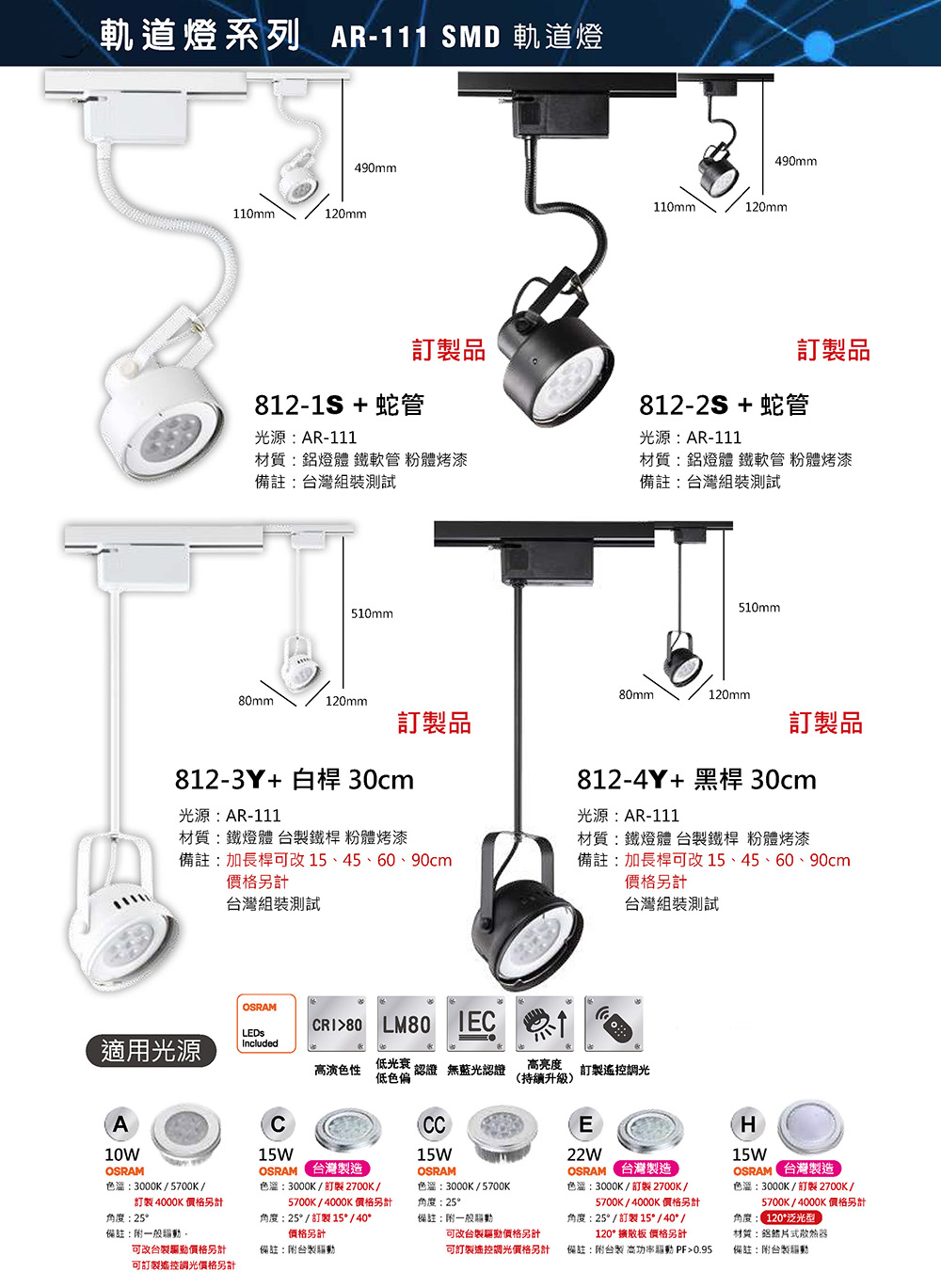 | 瓦數色溫 | A.10W.3000K, A.10W.5700K, A.10W.4000K, C.15W.3000K, C.15W.5700K, C.15W.2700K, C.15W.4000K, CC.15W.3000K, CC.15W.4000K, E.22W.3000K, E.22W.5700K, E.22W.2700K, E.22W.4000K, H.15W.3000K, H.15W.5700K, H.15W.2700K, H.15W.4000K |
