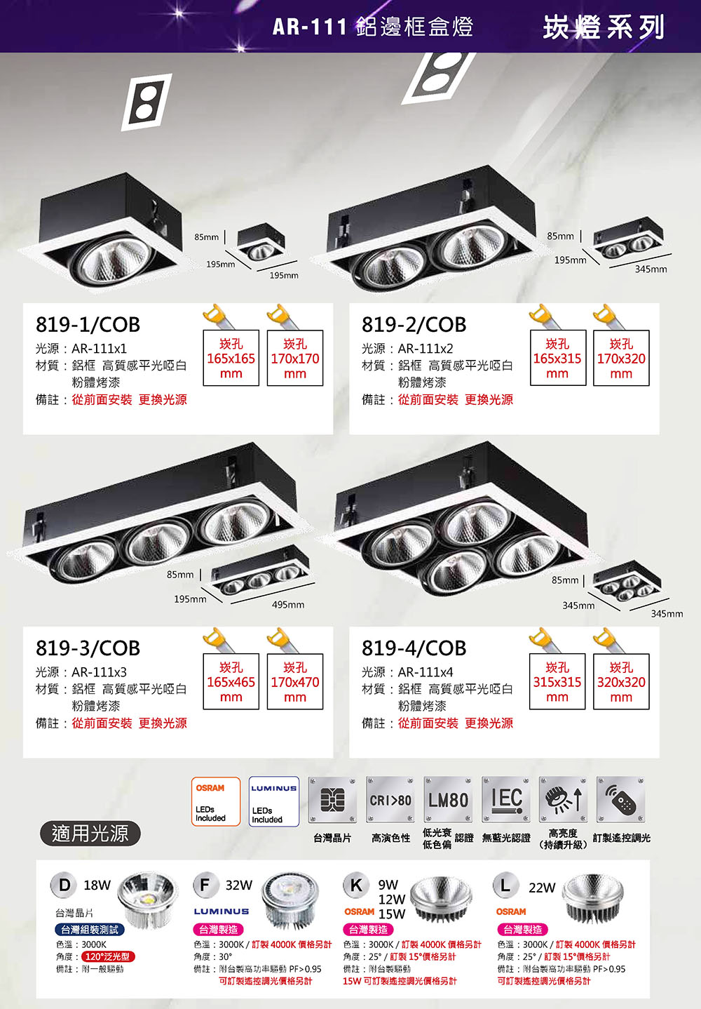 | 光源 | 空燈具不含光源, D.COB18W.3000K, F.COB32W.3000K, F.COB32W.4000K, K.COB9W.3000K, K.COB9W.4000K, K.COB12W.3000K, K.COB12W.4000K, K.COB15W.3000K, K.COB15W.4000K, L.COB22W.3000K, L.COB22W.4000K |