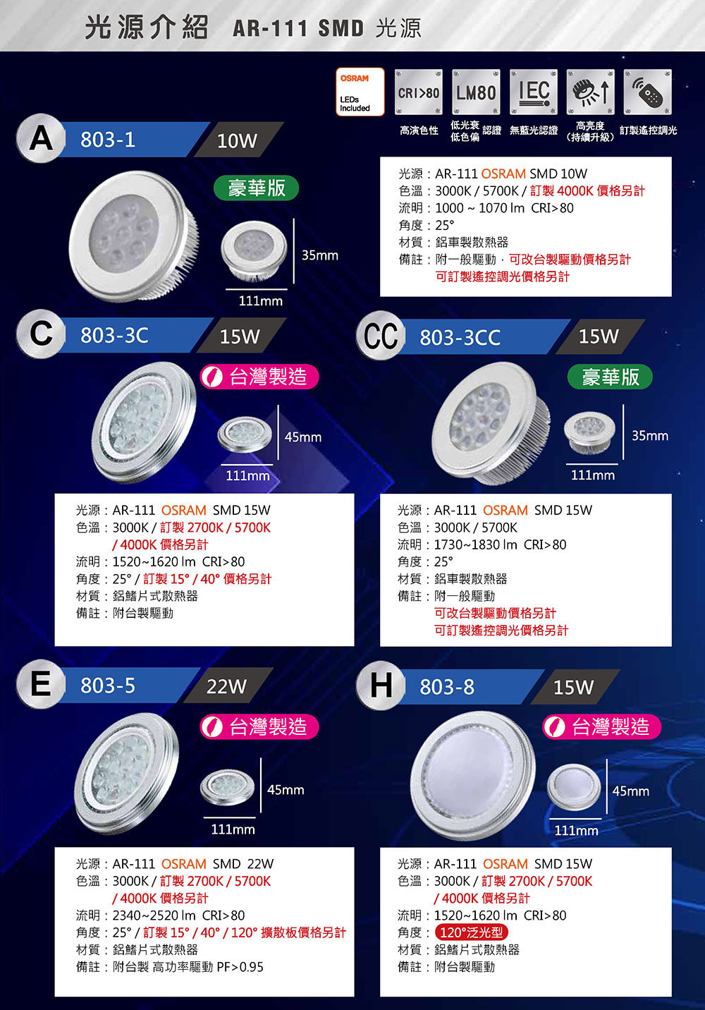| 瓦數色溫 | A.10W.3000K, A.10W.5700K, A.10W.4000K, C.15W.3000K, C.15W.5700K, C.15W.2700K, C.15W.4000K, CC.15W.3000K, CC.15W.4000K, E.22W.3000K, E.22W.5700K, E.22W.2700K, E.22W.4000K, H.15W.3000K, H.15W.5700K, H.15W.2700K, H.15W.4000K |