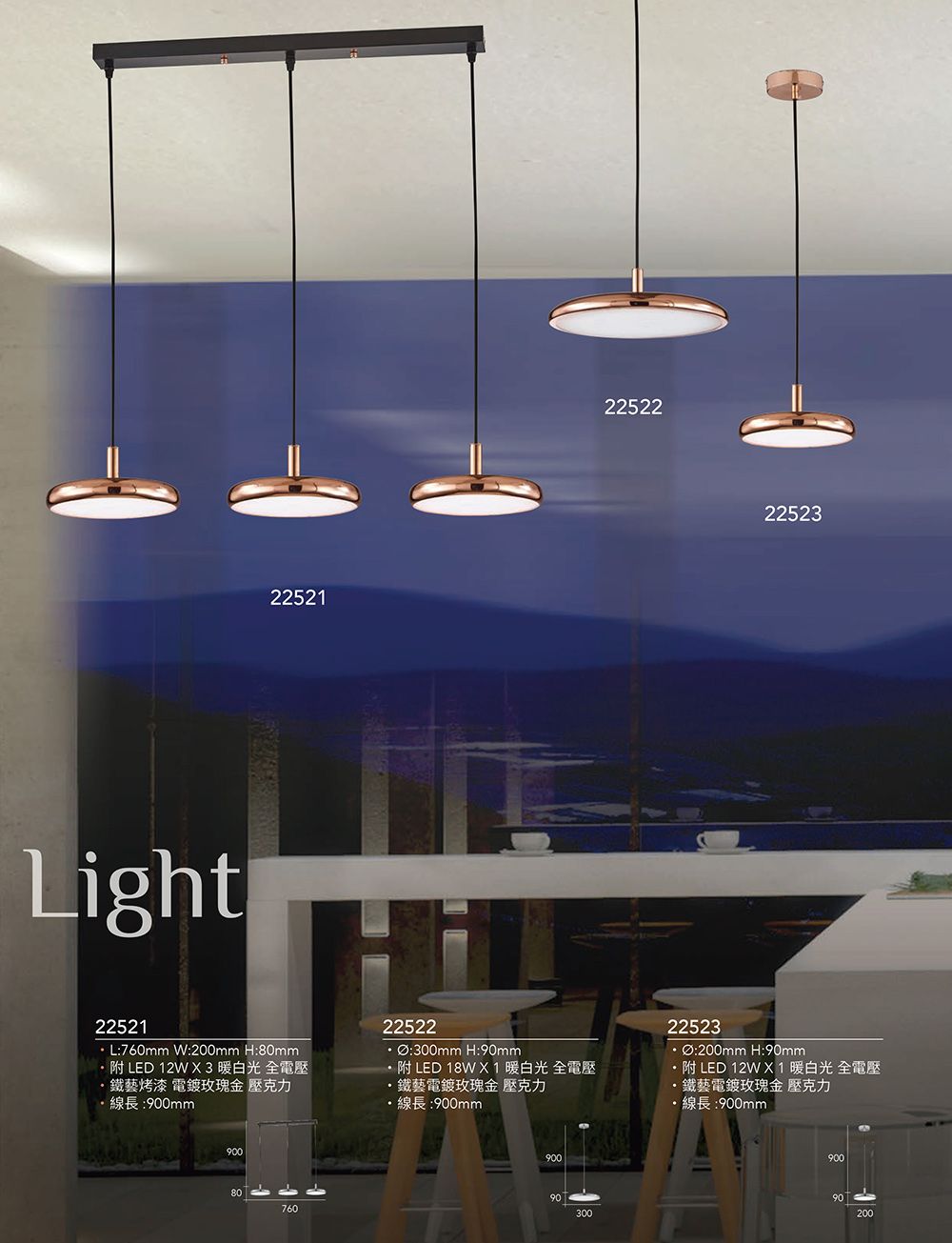 ・L:760mm W:200mm H:80mm ・附LED 12W X 3 暖白光 全電壓 ・鐵藝烤漆 電鍍玫瑰金 壓克力 ・線長:900mm