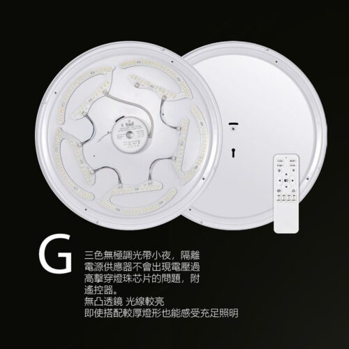 尺寸:Ø380 H110mm 材質:石化合成物 光源:(G)LED 48W / 三色無極調光 附遙控器 (可改為三色切換 不加遙控 價格請來電另詢)