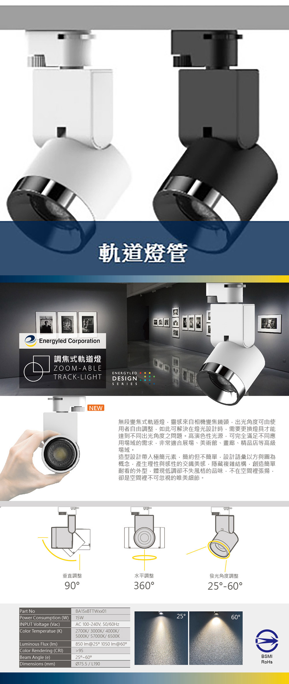調焦軌道燈 電軌式 / 角度:25~60 功率:15 W 光通量:850~1200Lm 色溫:3000K / 4000K 外殼顏色:黑色 / 白色