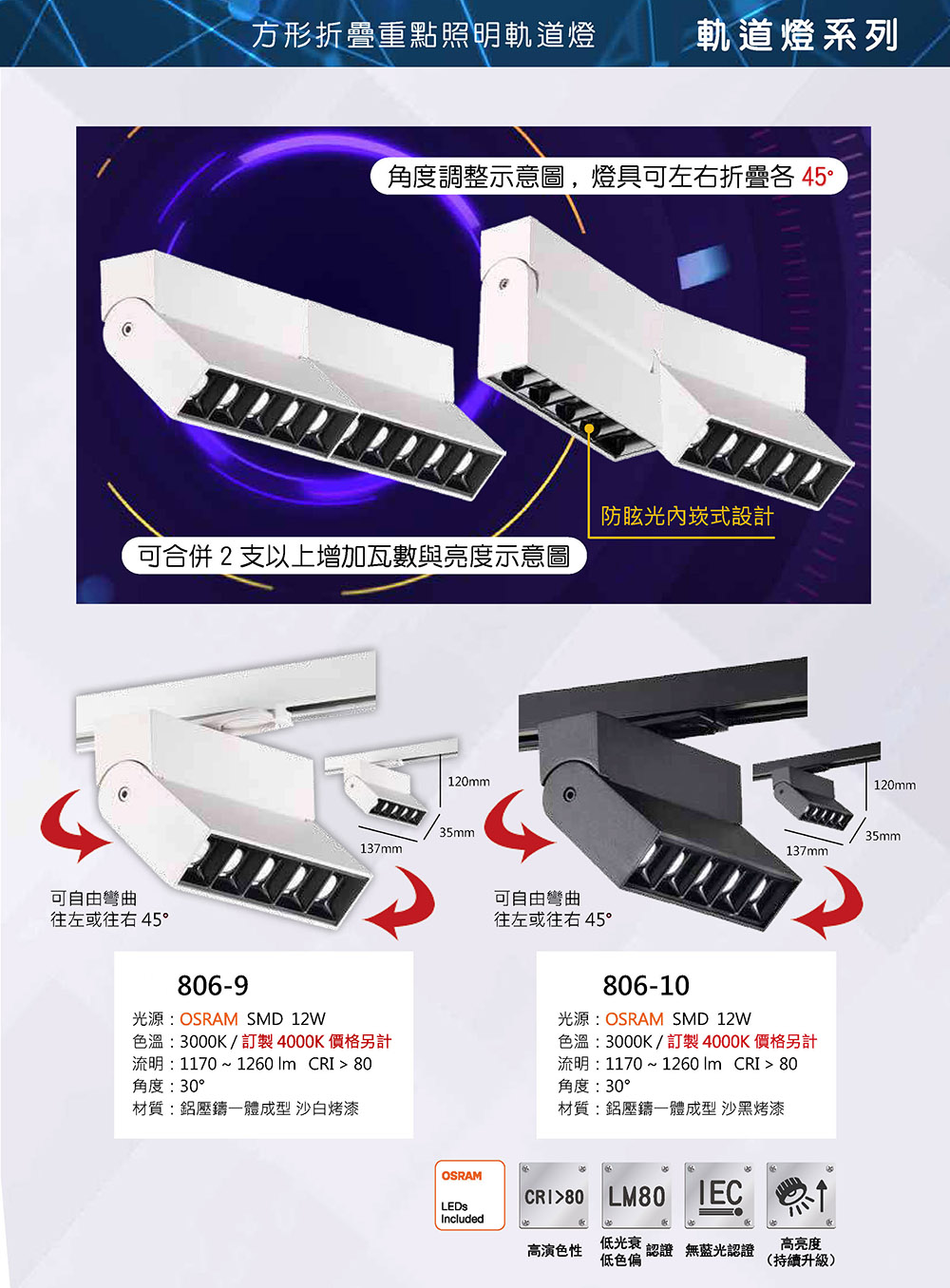 光源:OSRAM SMD 12W 色溫:3000K / 訂製 4000K 價格另計 流明:1170 ~ 1260 lm CRI > 80角度:30° 材質:鋁壓鑄一體成型 沙黑烤漆